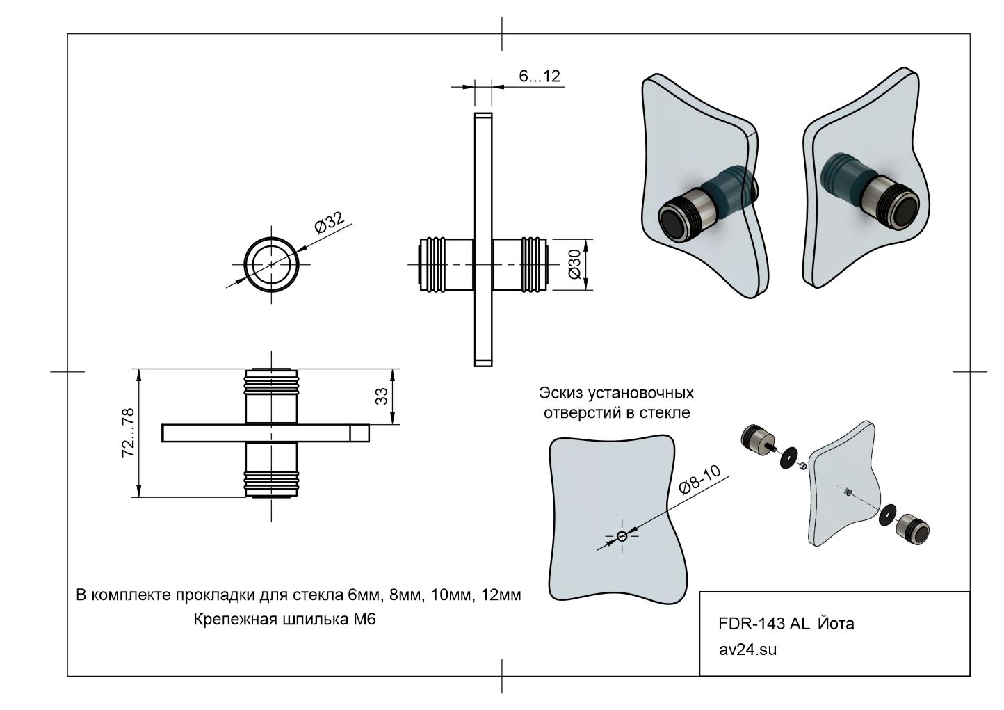 Ручка кноб для стеклянной распашной двери FDR-143 AL двухсторонняя ручка Йота. Используется для открывания и закрывания стеклянных дверей душевых кабин. Выполнена ручка для стекла из алюминия с резиновыми вставками с двух сторон. Подходит для установки на стекло толщиной 6-12 мм.