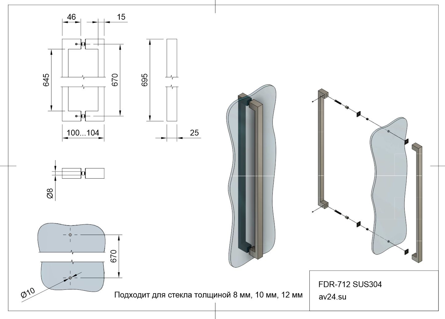 Ручка скоба для стеклянной душевой кабины FDR-712 SUS304/BTP выполнена из нержавеющей стали толщиной 1 мм в цвете брашированное золото, имеет межосевое расстояние 670 мм. Устанавливается вертикально или горизонтально, в таком случае удобно используется как держатель для полотенца. Предназначена для стекла толщиной 8-10 мм. Крепежный винт М6, пластиковая втулка 8 мм. Рекомендуемый диаметр отверстий в стекле душевой двери при установке ручки 10 мм. Габаритные размеры: длина 695 мм, ширина 25 мм.