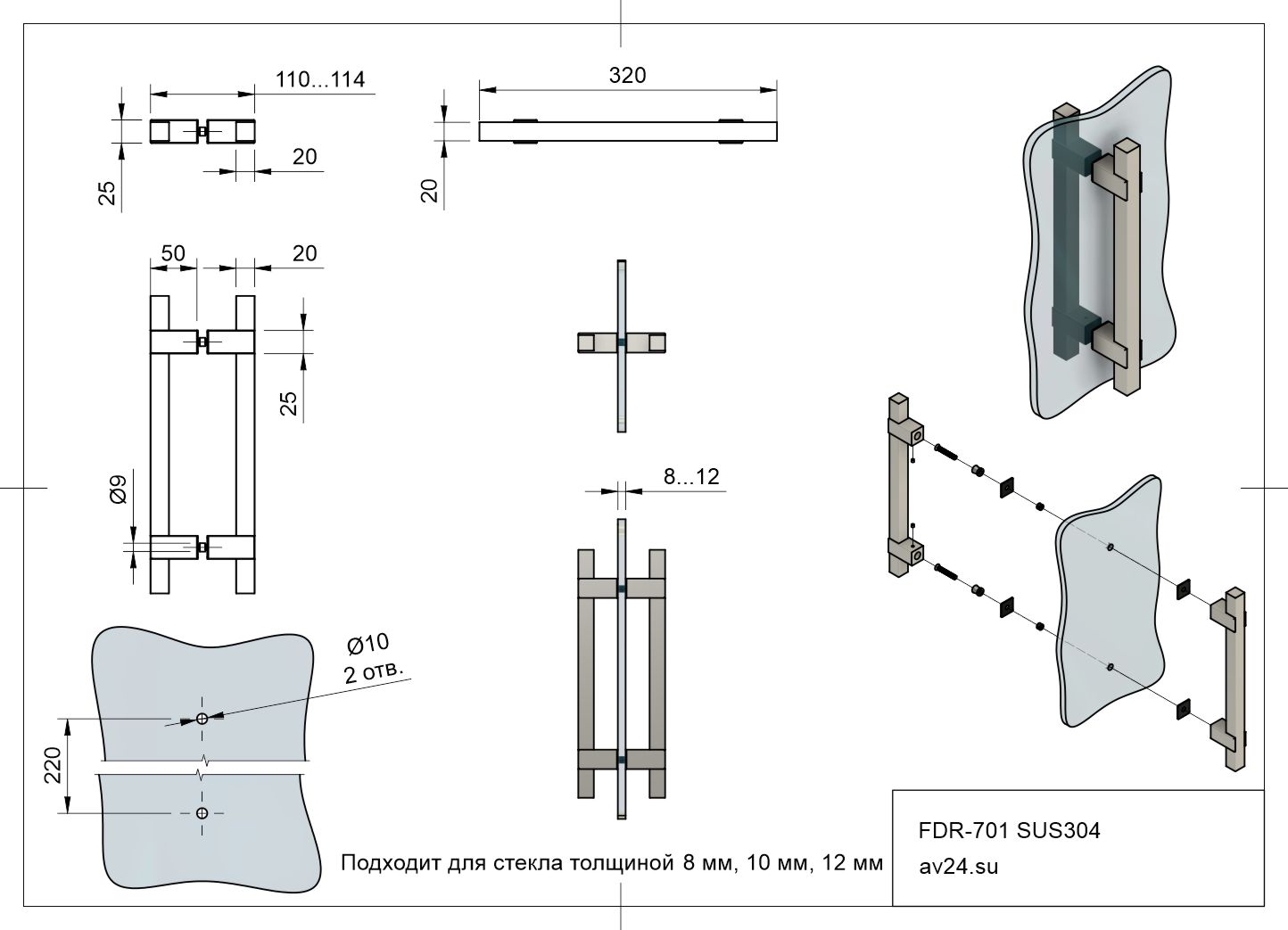 Ручка скоба для душевой кабины FDR-701 SUS304/BL из нержавеющей стали толщиной 1 мм в черной матовой отделке. Имеет межосевое расстояние 220 мм. Устанавливается преимущественно вертикально. Предназначена для стекла толщиной 8-10 мм. Крепежный винт М8. Рекомендуемый диаметр отверстий в стекле душевой двери при установке ручки 12 мм.