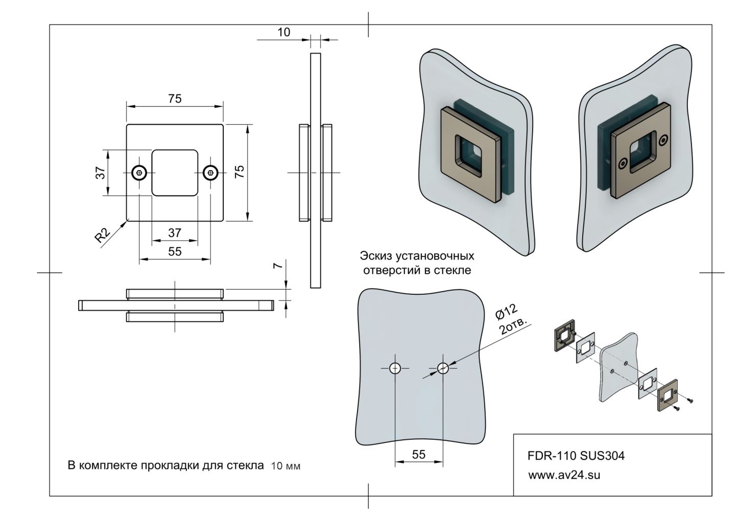 Ручка купе для стеклянной раздвижной двери FDR-110 SUS304/SSS Дриада. Используется для открывания и закрывания стеклянных дверей-купе душевых кабин. Выполнена ручка для стекла из нержавеющей стали в матовой отделке. Подходит для установки на стекло толщиной 10 мм. Размер квадратной ручки 77 х 77 мм. Межосевое расстояние 57 мм.