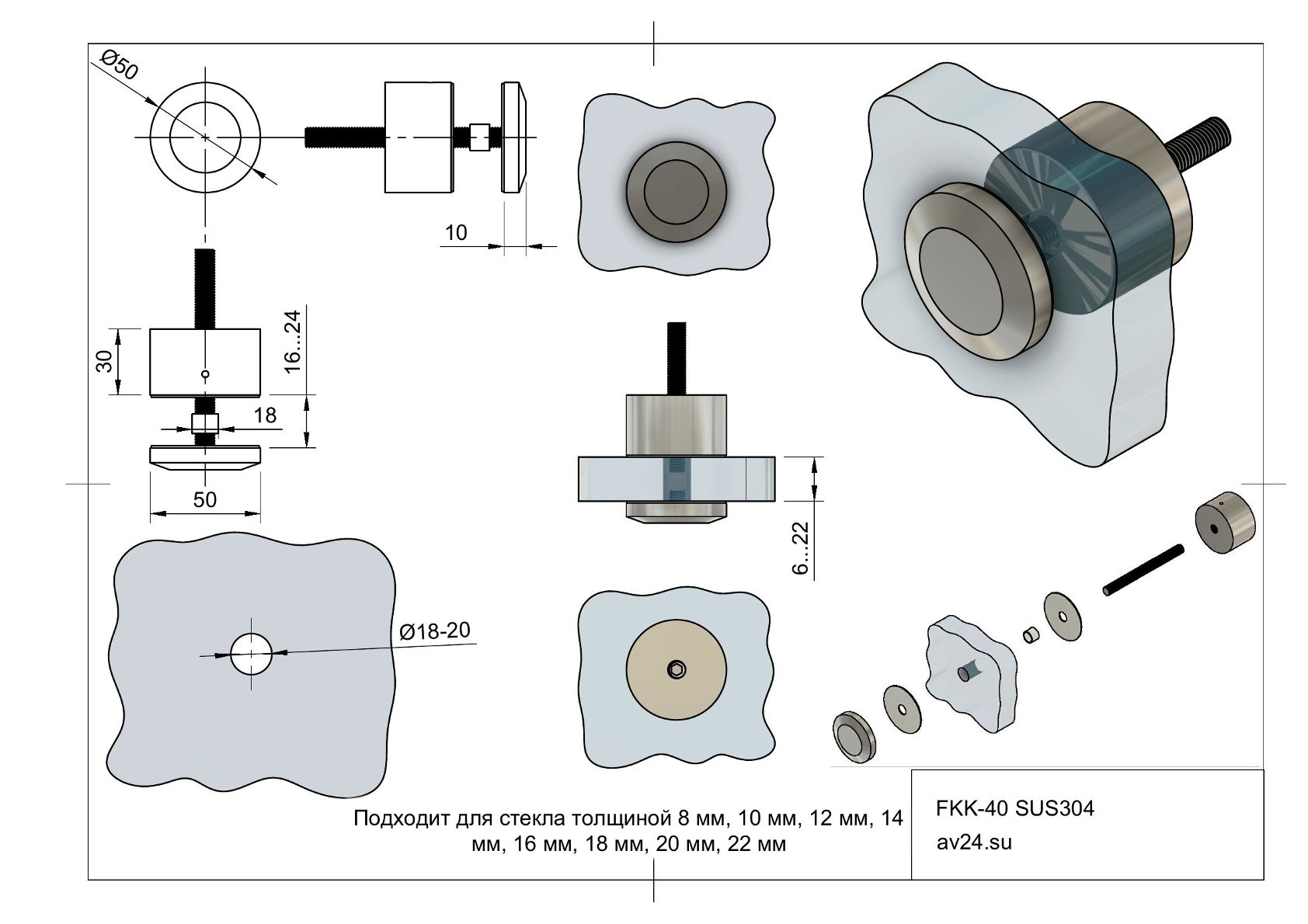 Стеклодержатель FKK-40 SUS304/BL, выполнен из нержавеющей стали в Черно матовой отделке. Применяется при изготовлении стеклянных ограждений для крепления стекла к торцу марша или балкона. В комплект входит шпилька, диаметром 10 мм (М10) и высотой 200 мм. Максимальная нагрузка на стеклодержатель 50 кг.