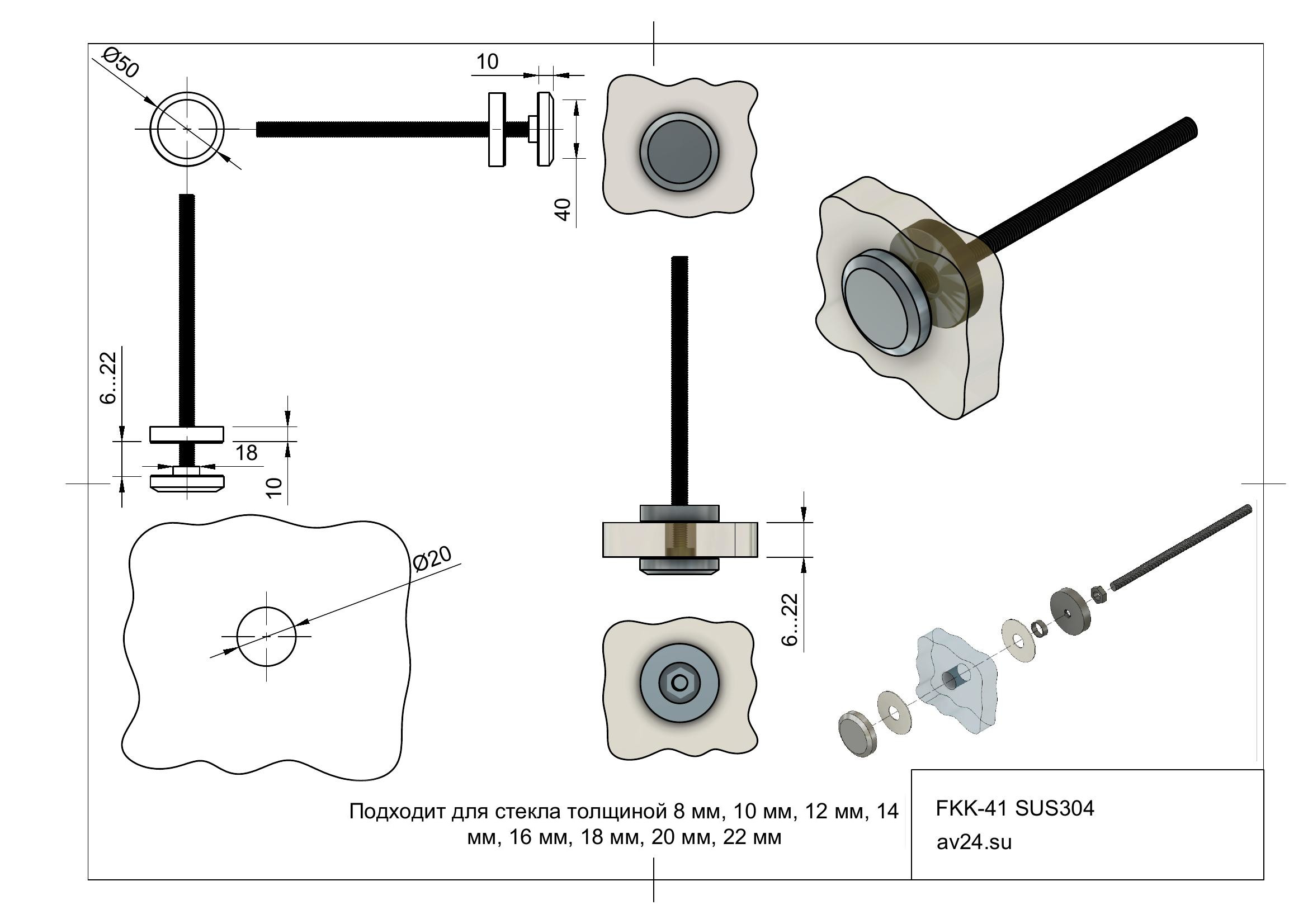 Стеклодержатель FKK-41 SUS304/SSS, выполнен из нержавеющей стали в Матовой отделке. Применяется при изготовлении стеклянных ограждений для крепления стекла к торцу марша или балкона. В комплект входит шпилька, диаметром 10 мм (М10) и высотой 200 мм. Максимальная нагрузка на стеклодержатель 50 кг.