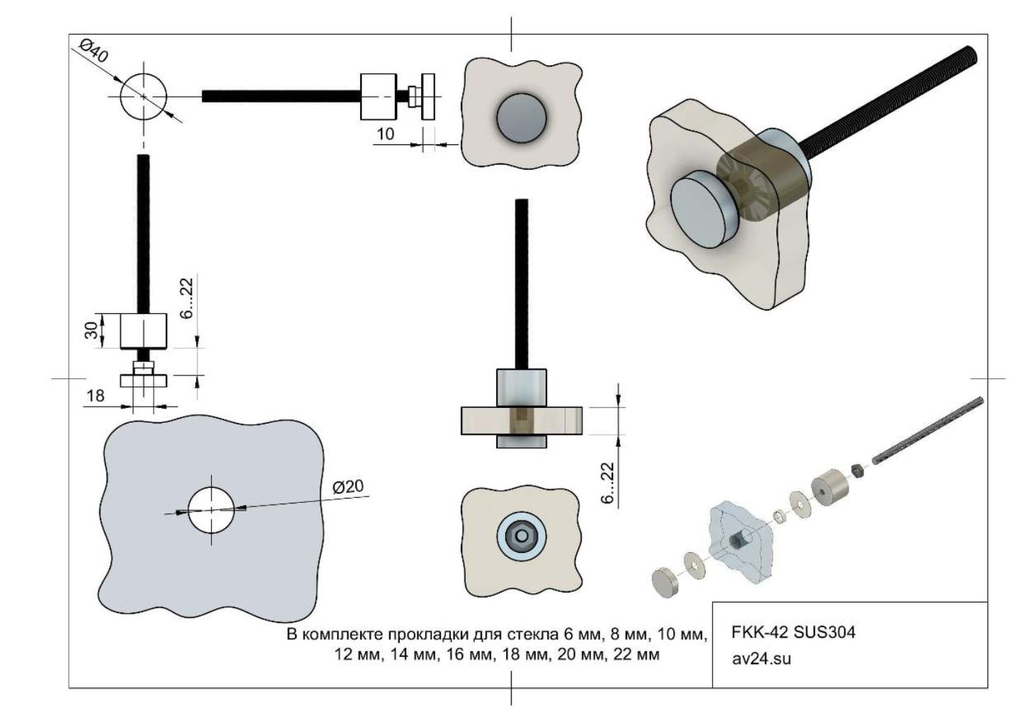 Стеклодержатель FKK-42 SUS304/SSS, выполнен из нержавеющей стали в матовой отделке. Применяется при изготовлении стеклянных ограждений для крепления стекла к торцу марша или балкона.В комплект входит шпилька, диаметром 10 мм (М10) и высотой 100 мм. Максимальная нагрузка на стеклодержатель 40 кг.
