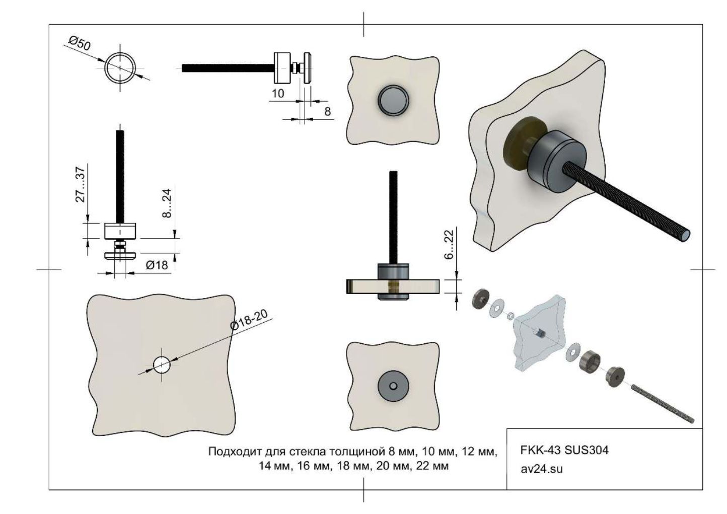 Стеклодержатель FKK-43 SUS304/BL, выполнен из нержавеющей стали в черной матовой отделке, регулируемый. Применяется при изготовлении стеклянных ограждений для крепления стекла к торцу марша или балкона. В комплект входит шпилька, диаметром 12 мм (М12). Максимальная нагрузка на стеклодержатель 50 кг.